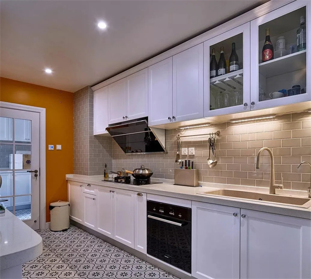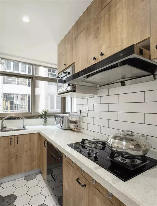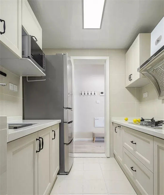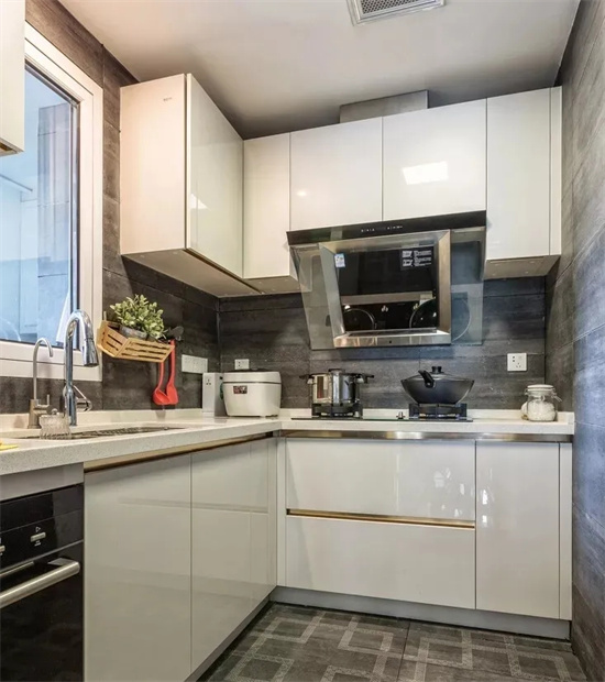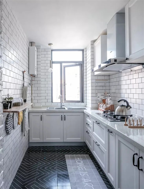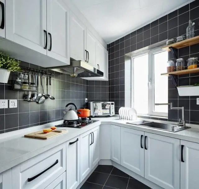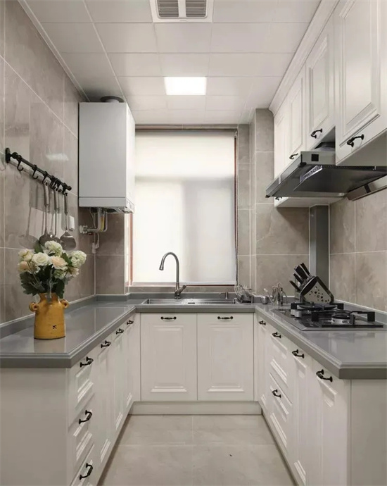 有些厨房规格偏长,长方形设计的厨房可以设计成“L”型,这样设计空间利用率更高,方便加装橱柜,增加储物空间。也方便动线设计,让整个厨房操作流程更顺手。