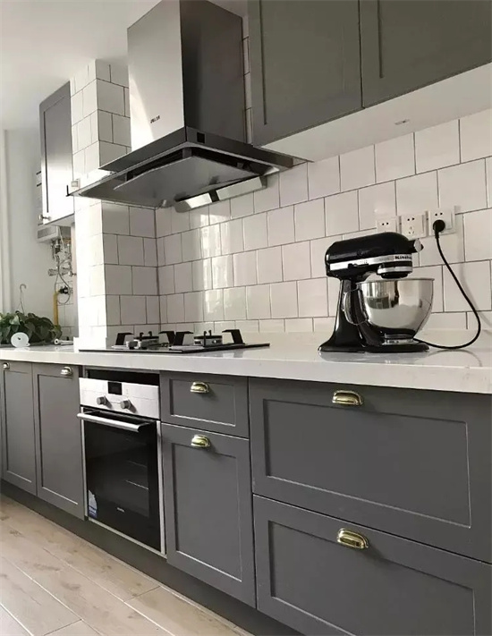 2. 台面高度设计:根据实际操作人高度,普遍为80-85cm,台面材料要选防水、防火,防腐蚀,易清洁的人造石英石材料。